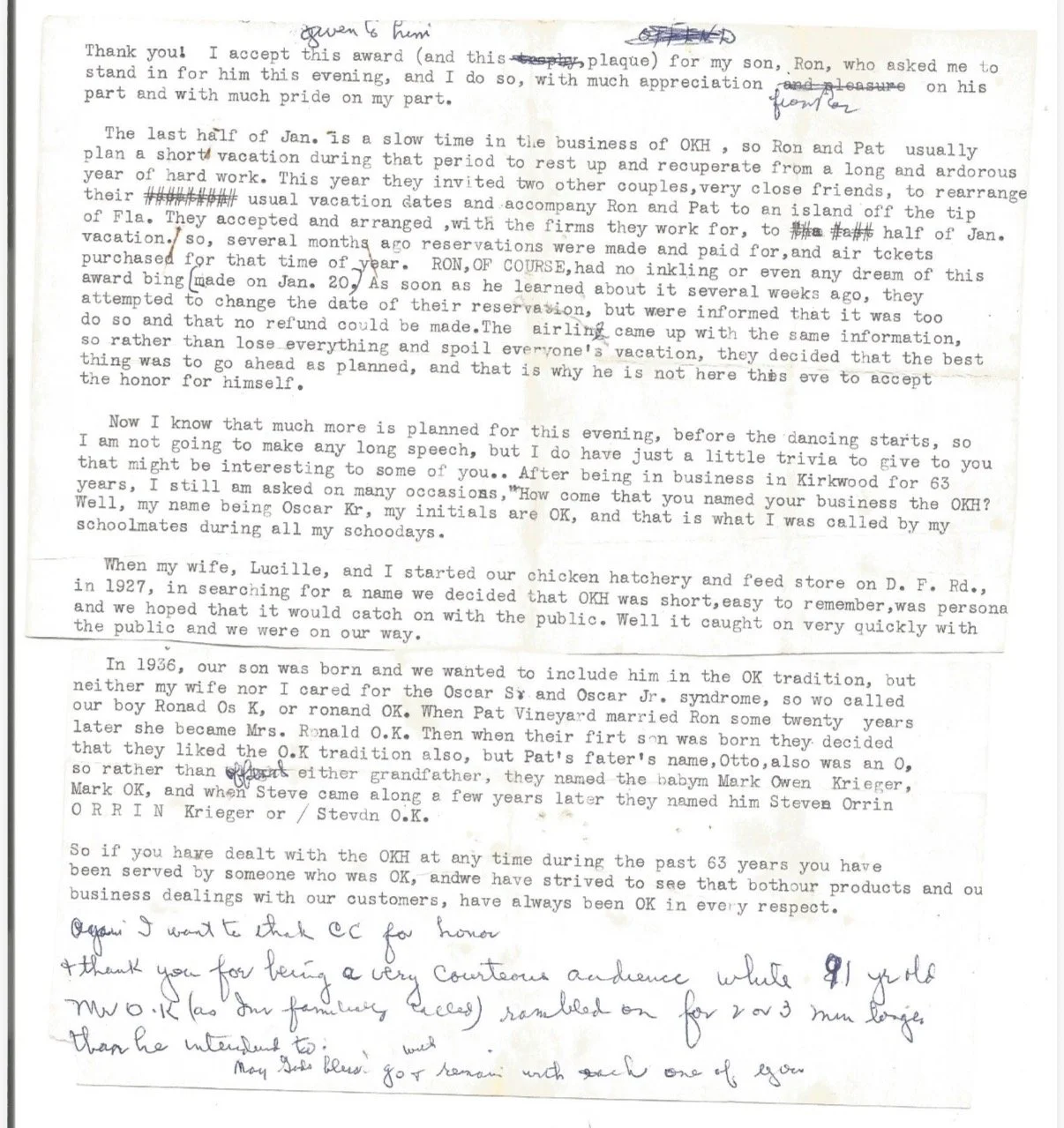 When originally awarded “Business of the Year” from the Chamber of Commerce, Ron and Pat were on vacation. However, that didn’t stop Rons father, Oscar, from giving this acceptance speech in their place: